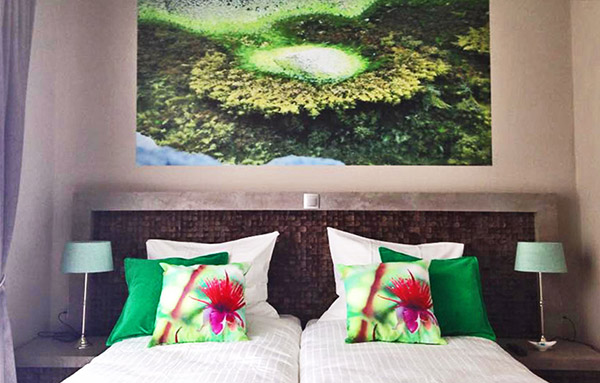Uit de beeldbank van Imadia werden 16 beelden gekozen, op kleur aangepast aan de inrichting van de kamer, en op 2 bij 1 meter afgedrukt op de hotelkamers gehangen. Heel bijzonder om de beelden zo mooi in elke hotelkamer te zien en ook leuk om de styling voor de fotografie voor booking.com samen met de eigenaar en gastvrouw Ingrid Tsakonis te doen.