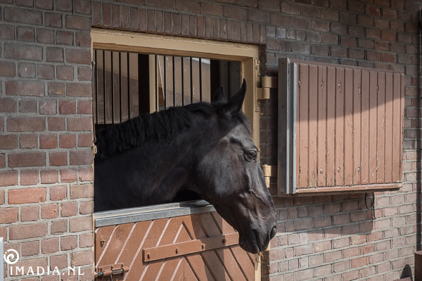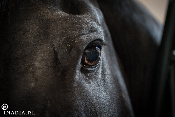 Het oog van één van de Friese hengsten die in de stallen hun thuis hebben.