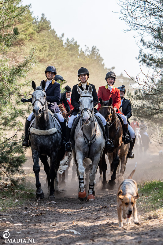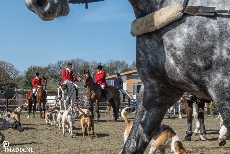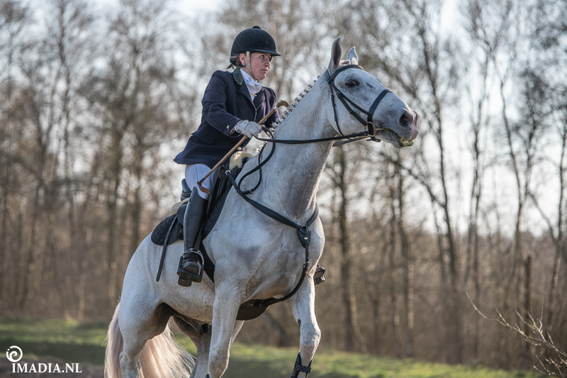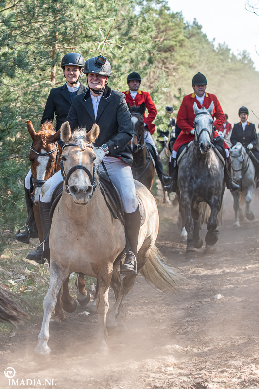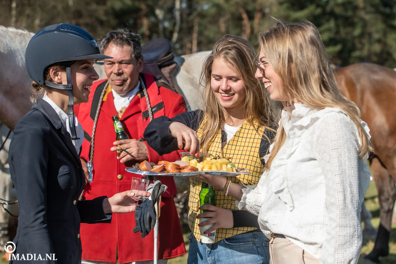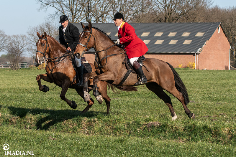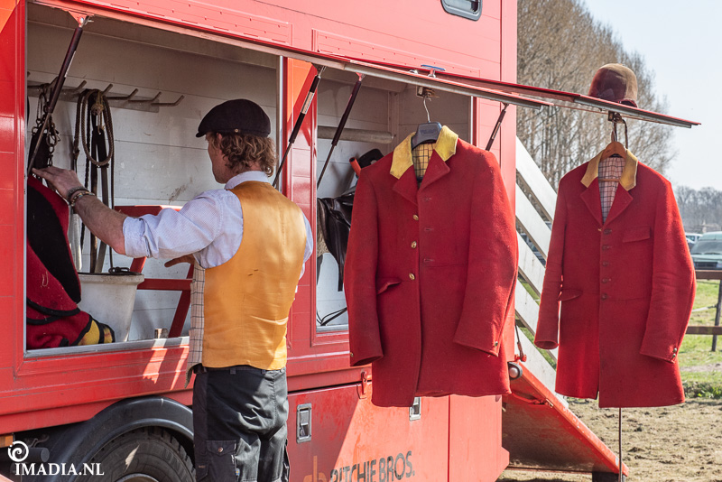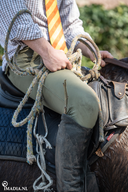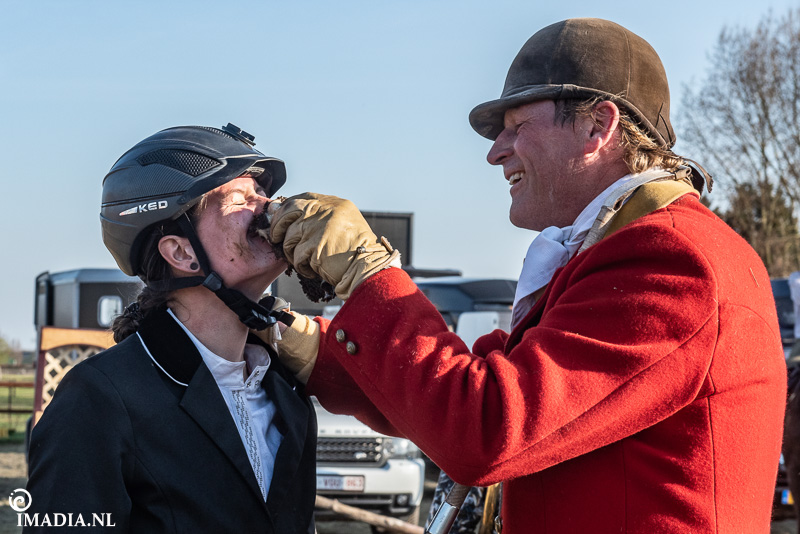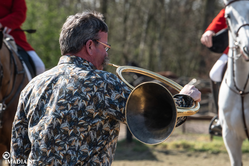 Op 20 april van 2024 werd het NK Jachtpaarden georganiseerd in Maarsbergen. Dat herinnerde mij eraan dat ik een jaar of wat geleden een traditionele slipjacht mocht vastleggen voor de Hoefslag. Samen met hoofdredacteur Denise Dekens reed ik (in een jeep) mee met de laatste slipjacht van dat jaar. De (slip)jacht staat bol van mooie tradities en rituelen. Je stelt je als deelnemer altijd voor aan de Master, die de jacht leidt. Dat doe je uiteraard in een tweed jasje en je drinkt daarbij een portje. Daarna wordt het sein ’te paard’ gegeven en verzamelen ruiters en paarden zich bij de Sonneur. Alle ruiters hebben het tweedjasje inmiddels ingewisseld voor correcte rijkleding met plastron (sjaaltje). De plastronspeld wordt horizontaal aangebracht, behalve bij de Master, die draagt hem verticaal. Traditioneel diende de plastron en speld om tijdens de jacht eventuele verwondingen bij paard of mens te verbinden. Er wordt een klein slokje genomen op een goede jacht en dan geeft de Sonneur het sein dat de jacht mag beginnen.