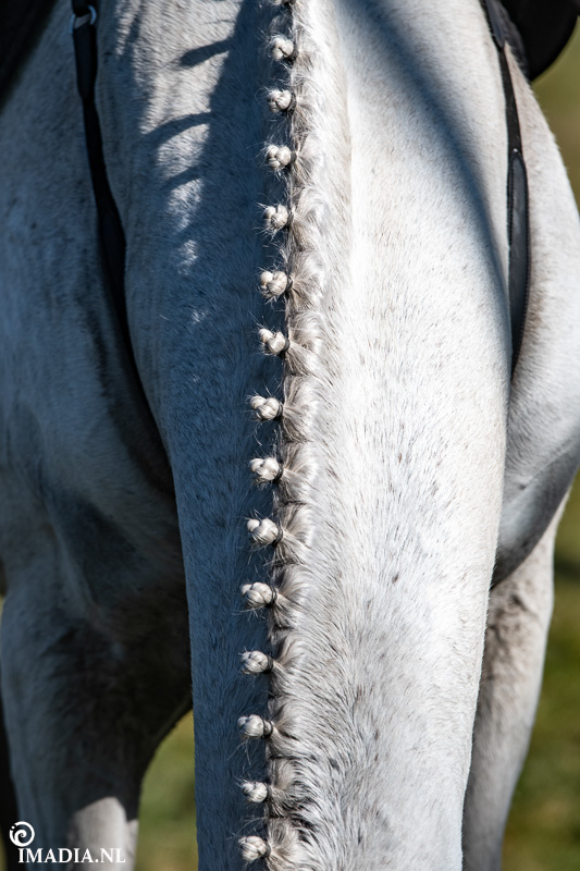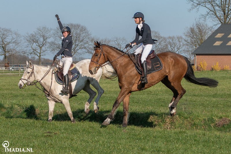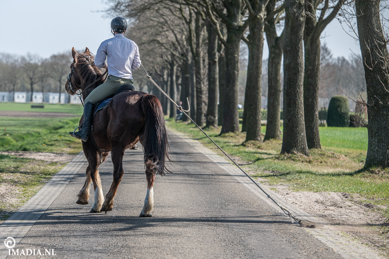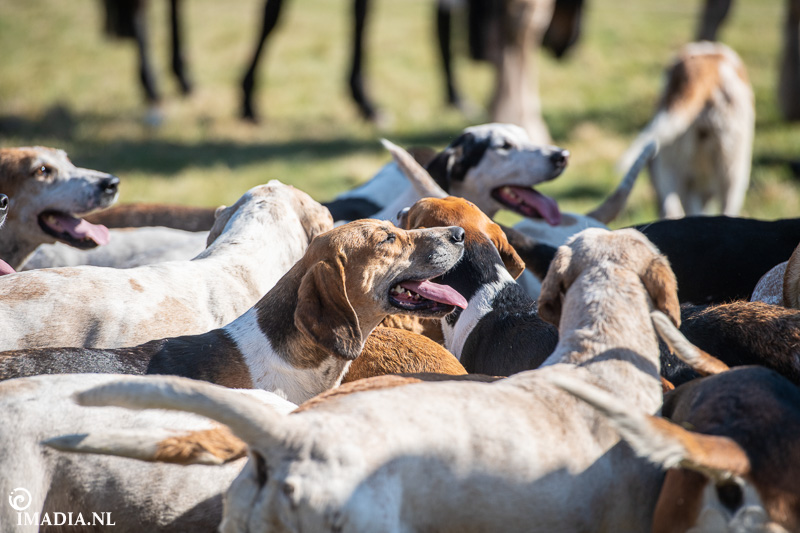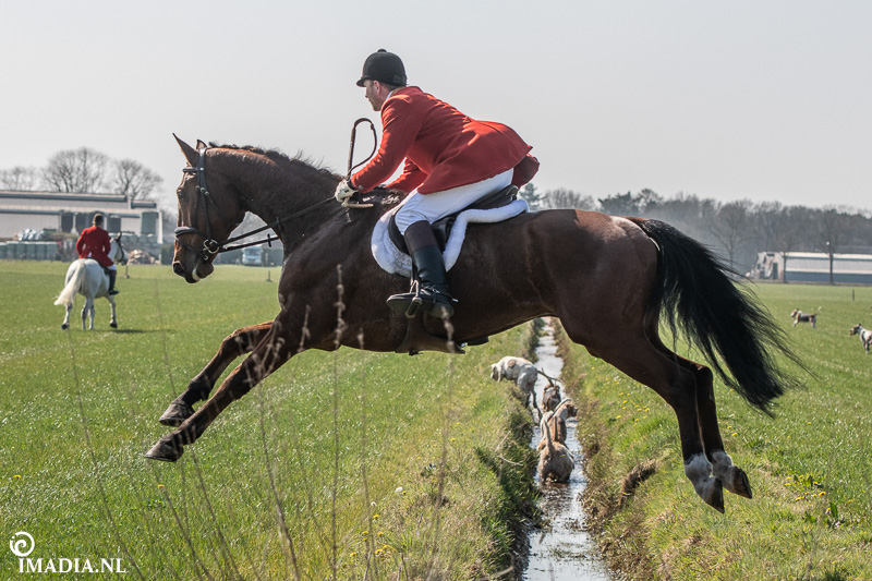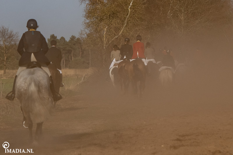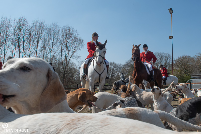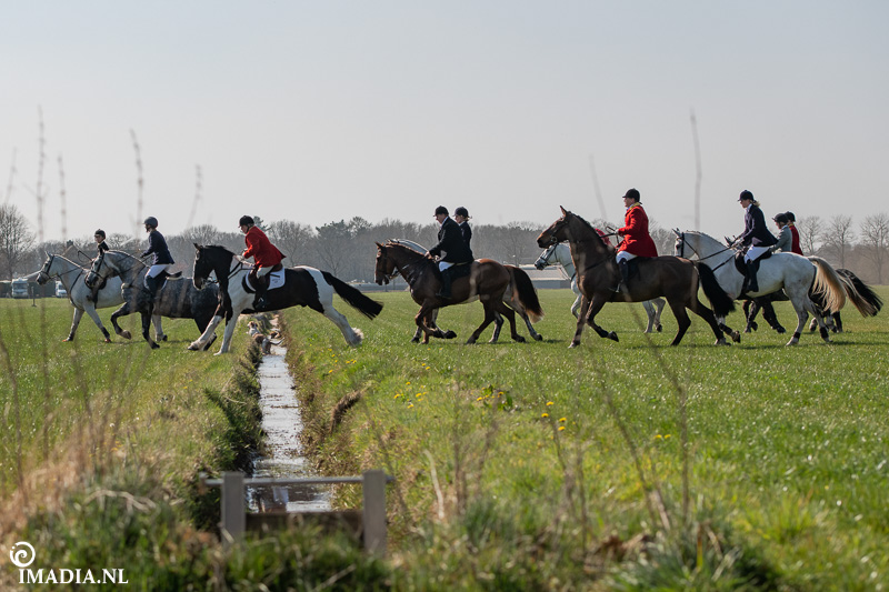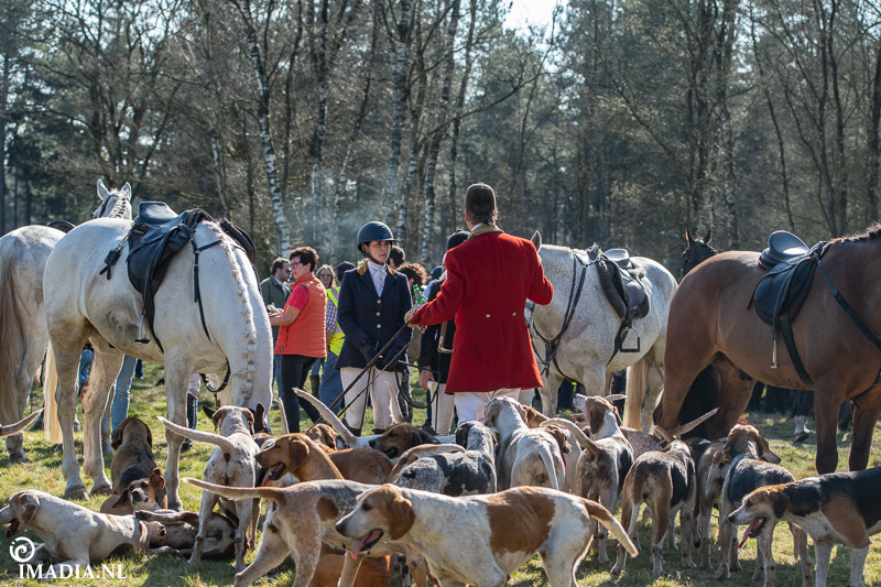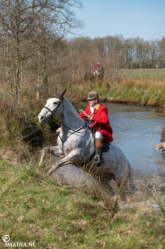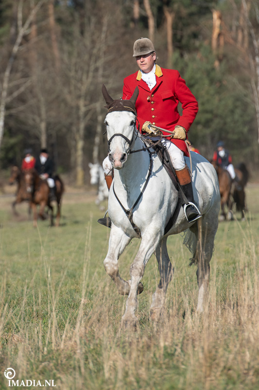 Op 20 april van 2024 werd het NK Jachtpaarden georganiseerd in Maarsbergen. Dat herinnerde mij eraan dat ik een jaar of wat geleden een traditionele slipjacht mocht vastleggen voor de Hoefslag. Samen met hoofdredacteur Denise Dekens reed ik (in een jeep) mee met de laatste slipjacht van dat jaar. De (slip)jacht staat bol van mooie tradities en rituelen. Je stelt je als deelnemer altijd voor aan de Master, die de jacht leidt. Dat doe je uiteraard in een tweed jasje en je drinkt daarbij een portje. Daarna wordt het sein ’te paard’ gegeven en verzamelen ruiters en paarden zich bij de Sonneur. Alle ruiters hebben het tweedjasje inmiddels ingewisseld voor correcte rijkleding met plastron (sjaaltje). De plastronspeld wordt horizontaal aangebracht, behalve bij de Master, die draagt hem verticaal. Traditioneel diende de plastron en speld om tijdens de jacht eventuele verwondingen bij paard of mens te verbinden. Er wordt een klein slokje genomen op een goede jacht en dan geeft de Sonneur het sein dat de jacht mag beginnen.