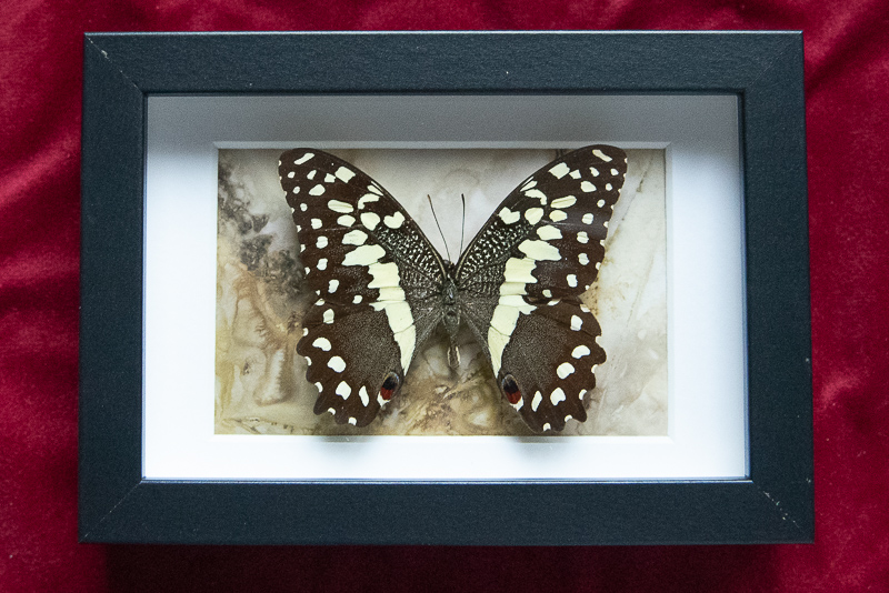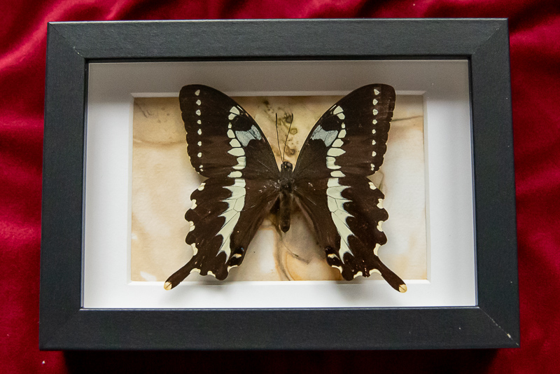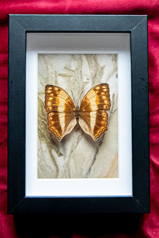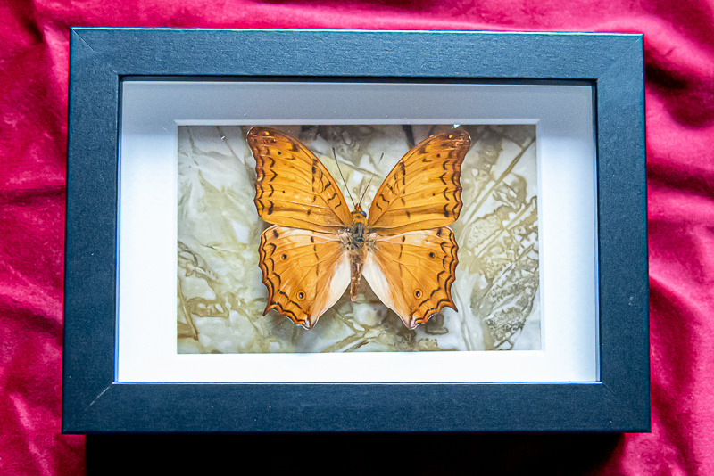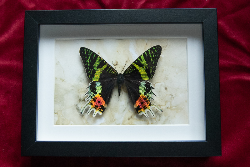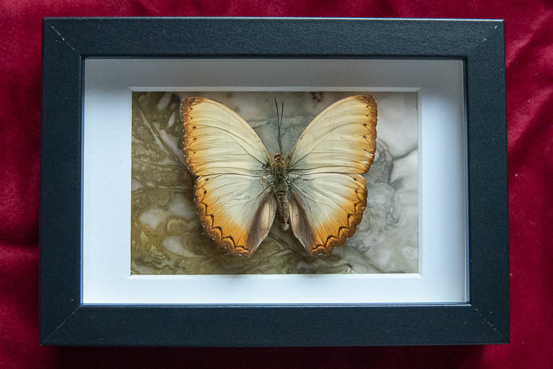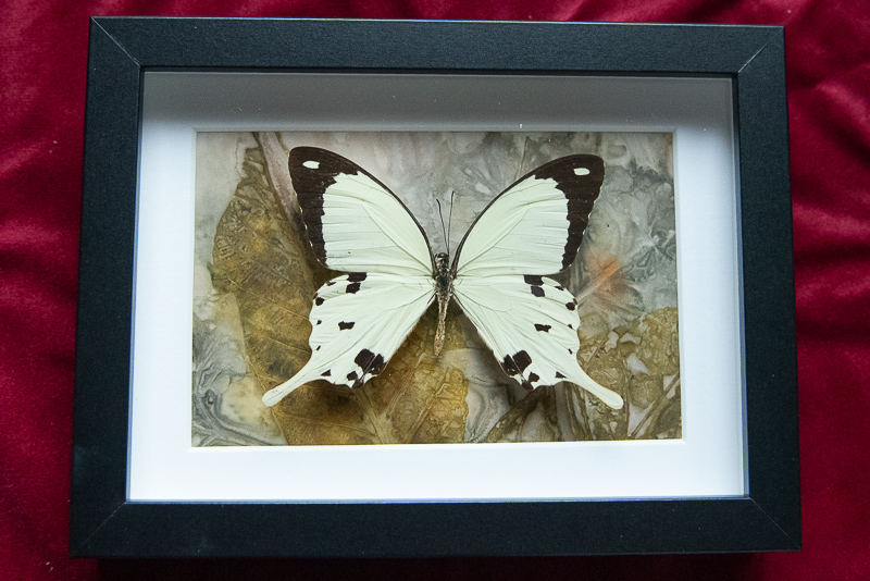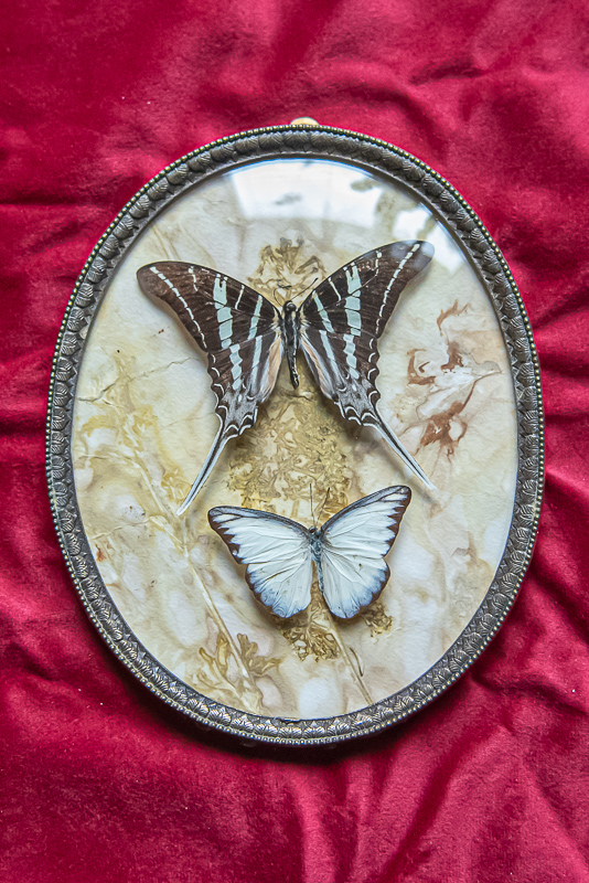 Deze vlinders zijn ingelijst in een antiek lijstje met bol glas: