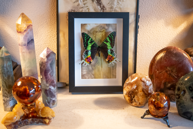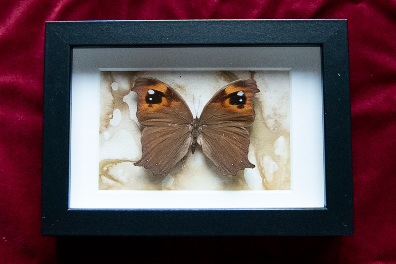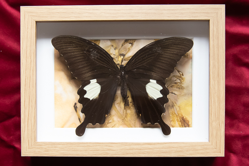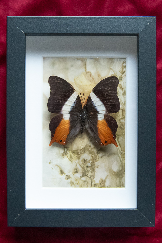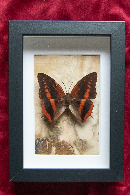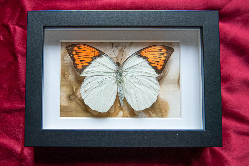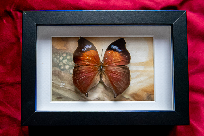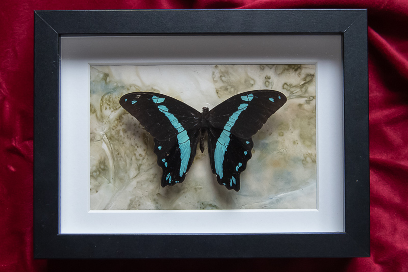 Deze vlinders zijn ingelijst in een antiek lijstje met bol glas: