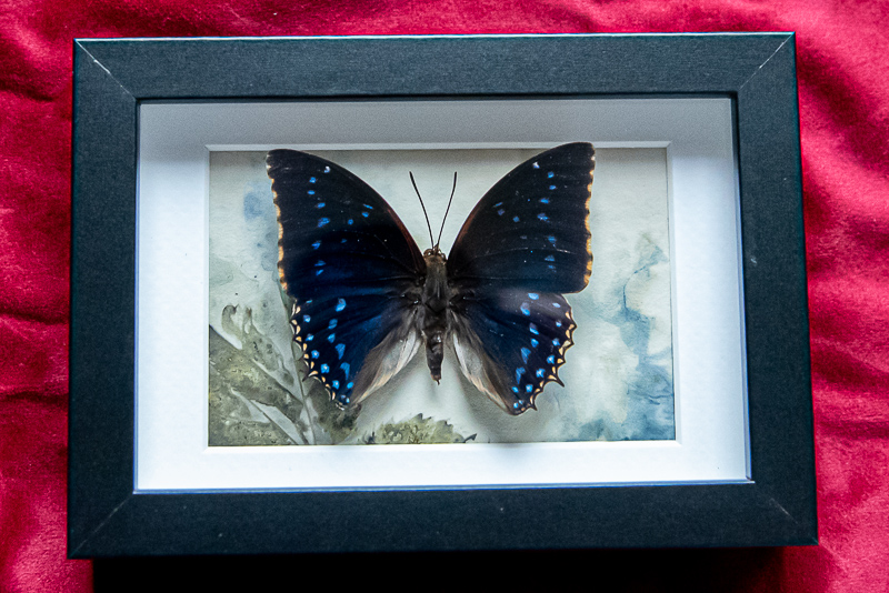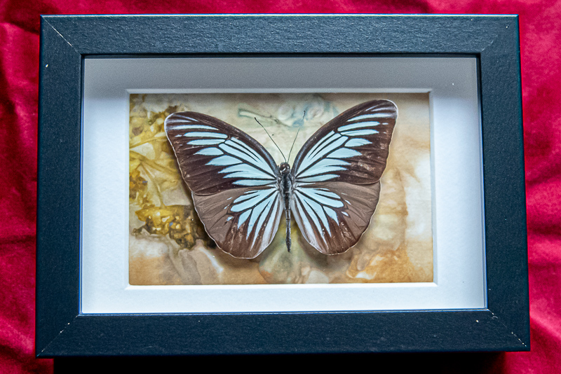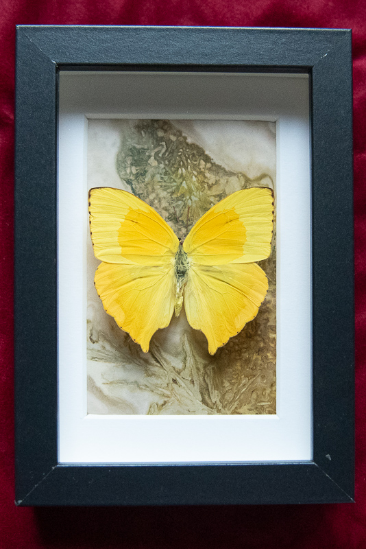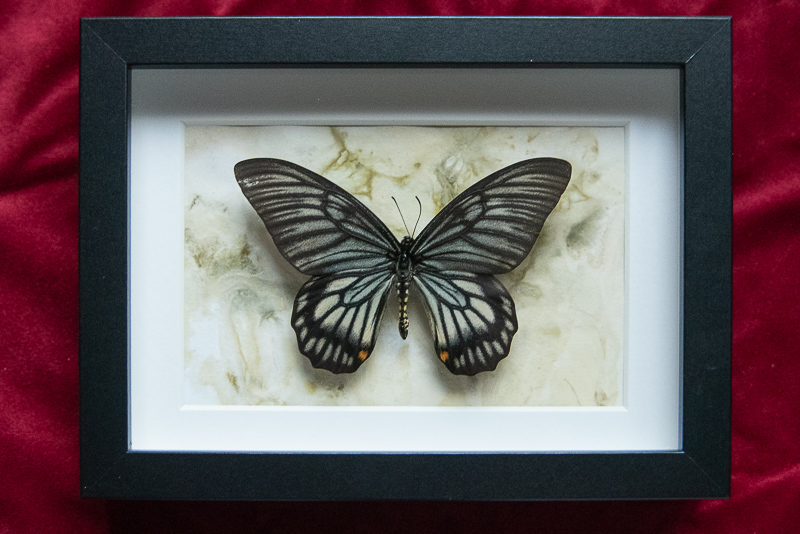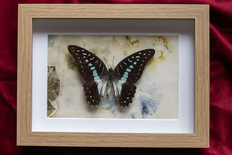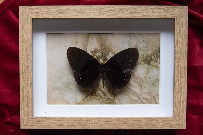 Elise houdt van vlinders. Met uiterste precisie prepareert ze deze mooie wezens en lijst ze in op eco-print papier dat ik (Diana) maakte met afdrukken van planten en hun eigen verfstoffen. De combinatie is zo mooi! Maar ze heeft er inmiddels teveel om thuis neer te zetten ;-). Langs deze weg biedt ze haar vlinders aan aan jullie. Als herinnering aan een geliefde of gewoon omdat ze zo mooi zijn.