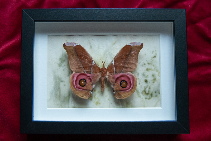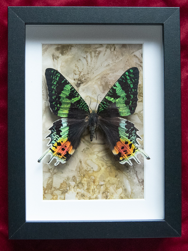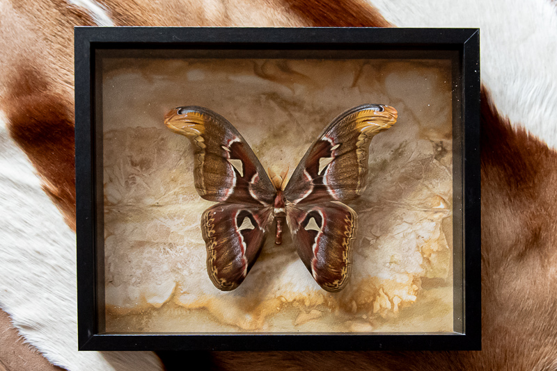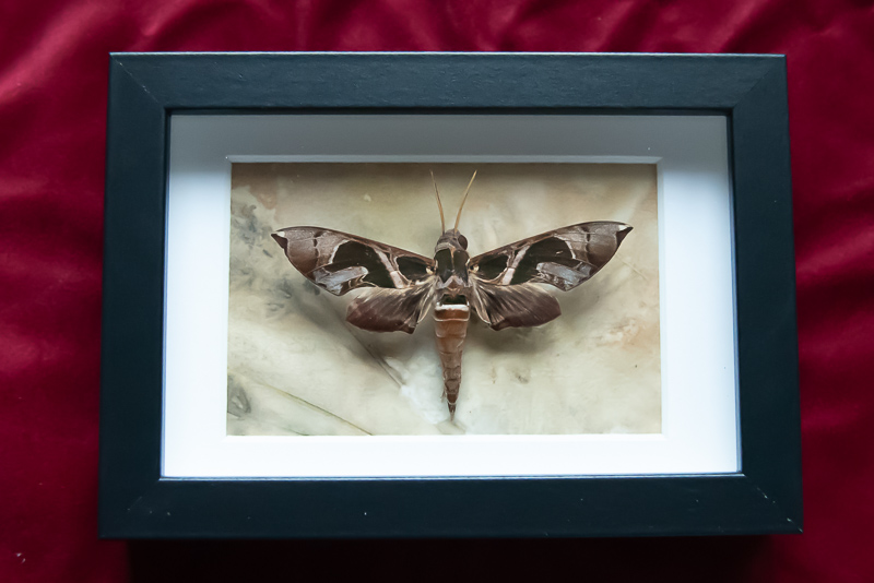 Als laatste, en niet te koop, is dit de Atlasvlinder (Attacus atlas), een dagactieve nachtvlinder. Elise prepareerde hem speciaal op mijn verzoek. Hij is heel erg groot en prachtig. Als je hem ook zo mooi vindt kun je hem eventueel nabestellen bij Elise. (€ 40)